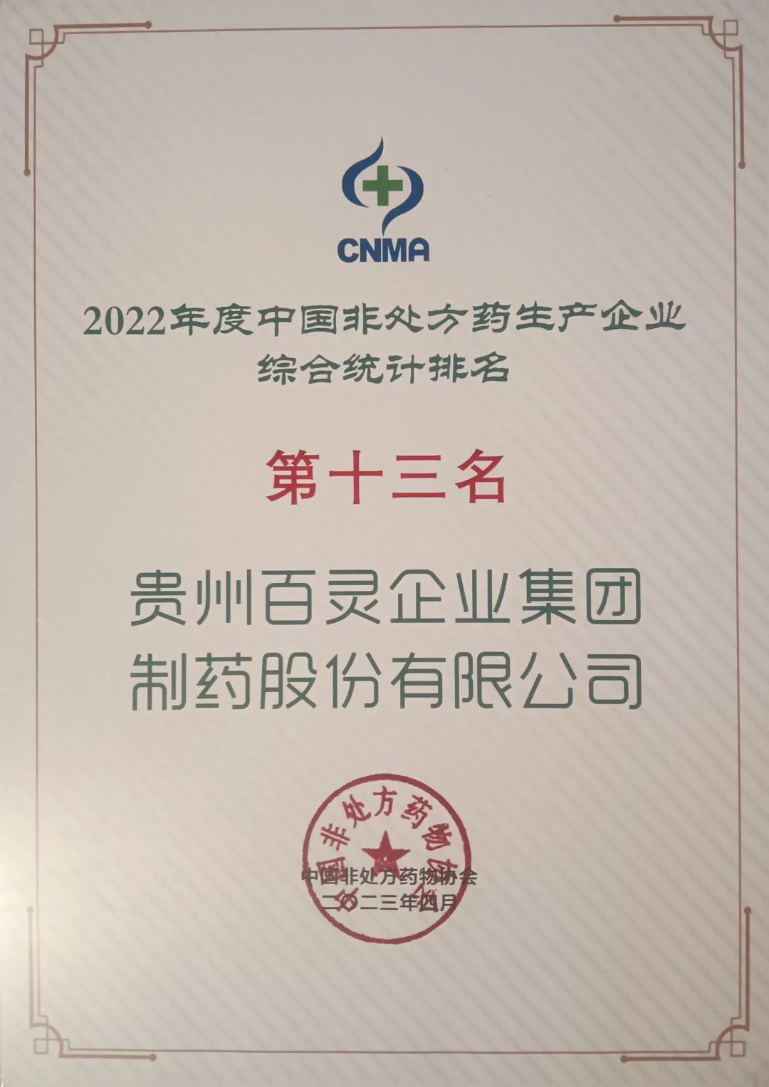 最新年度排名中,凭借强劲的综合实力及出色的产品市场表现,贵州百灵荣登“2022年度中国非处方药生产企业榜”第十三位,创历史新高,并荣获“抗疫保供责任担当企业”称号,同时,贵州百灵咳速停糖浆/胶囊、小儿柴桂退热颗粒、双羊喉痹通颗粒等多款产品稳居各类别产品榜前列,排名持续上升。