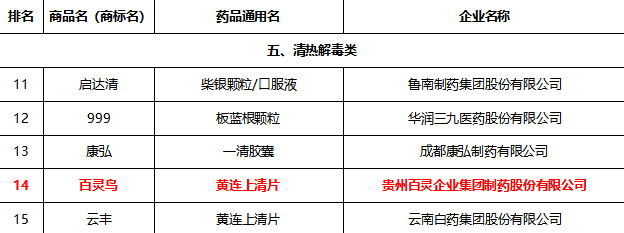 黄连上清片获得“中成药·清热解毒类”第14名。