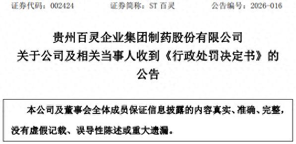 3 月 28 日,ST 百灵(002424)发布公告,公司及 10 名相关当事人因信息披露违法违规,收到贵州证监局《行政处罚决定书》,公司被处以 1000 万元罚款,董事长姜*不仅被罚 500 万元,还遭 10 年证券市场禁入,其余 9 名高管及独董也均被处罚。