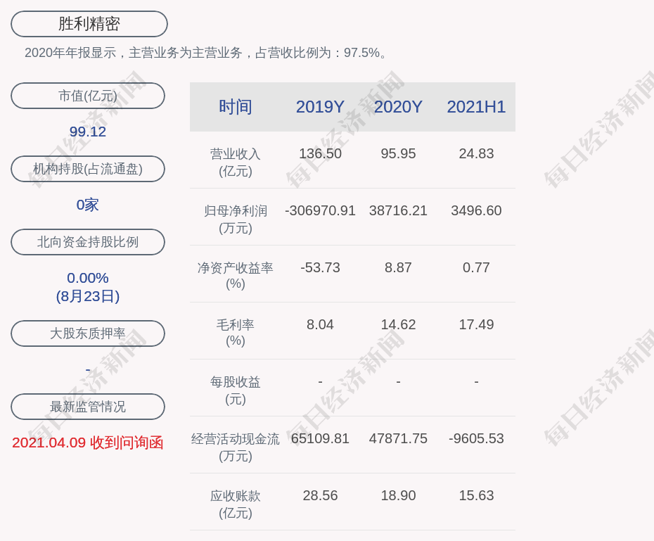 2020年年报显示,胜利精密的主营业务为主营业务,占营收比例为:97.5%。