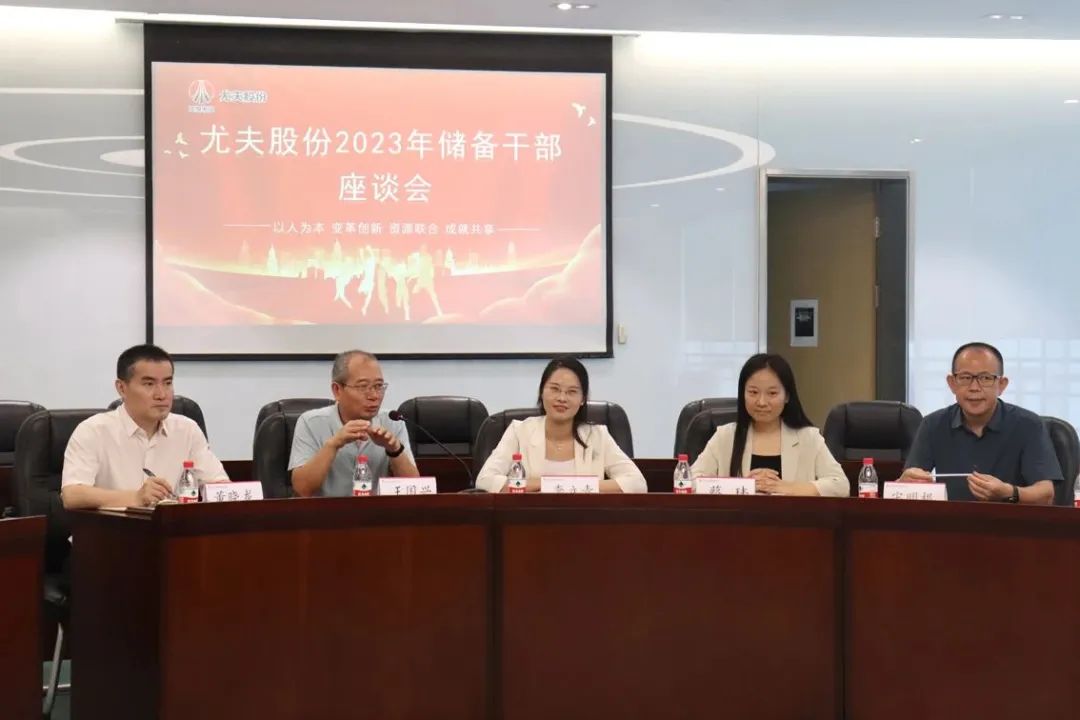 “青春启航,筑梦尤夫”,为适应公司人才发展战略,使新进员工尽快融入公司文化。2023年7月20日上午,尤夫股份2023年储备干部座谈会在行政楼二楼圆桌会议室顺利举行。公司董事长李立青、总经理王国兴、各中心负责人和代表,及20位硕士储备干部出席会议。