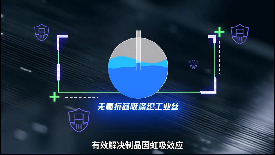 在以“双碳”政策为导向的背景下,向绿而行,探索绿色化学技术是大势所趋。而产业用纤维,以硬核实力托举新高地,引领绿色低碳潮流。在产业用纺织品领域中,以聚酯工业丝为原料的产品,往往在使用过程中因虹吸效应常导致边缘处有液体进入,从而影响纺织品外观,甚至引起纺织品发生霉变,降低材料的性能,进而威胁材料服役安全。传统的抗芯吸型涤纶工业丝常采用含氟化物进行处理,但其在生产和使用的过程中,氟化物会对环境产生不利影响。而无氟环保后整理的聚酯工业丝,其强度高、助剂环保、抗芯吸性能持久,能有效解决制品因虹吸效应出现外观变差、霉变等问题,唤醒城市的霓虹斑斓。