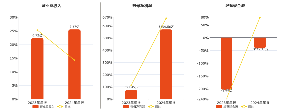 公司营业总收入为7.67亿元。归母净利润为5309.56万元。经营活动现金净流入为-3117.15万元。