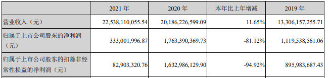 2021年兆驰股份实现营业收入225.38亿,同比增长11.65%;归属于上市公司股东的净利润3.33亿,较上年下降14.3亿,降幅为81.12%。归属于上市公司股东的扣除非经常性损益的净利润0.83亿,较上年下降15.5亿,降幅为94.92%。