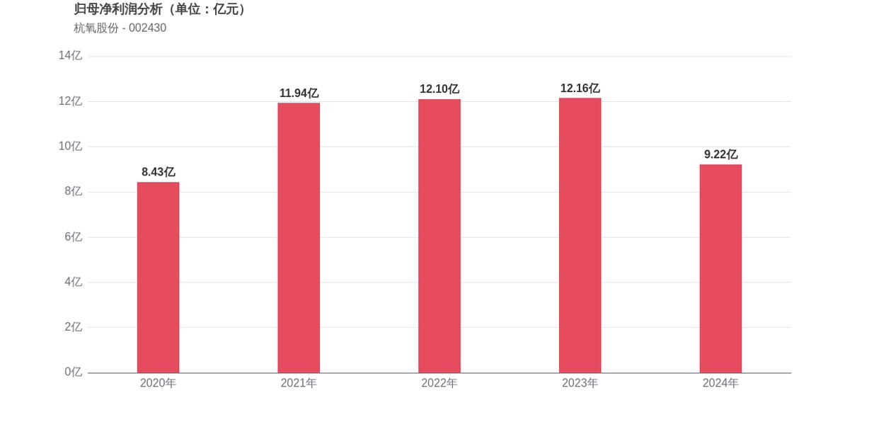 利润角度分析,2020年杭氧股份实现归母净利润8.43亿元,2024年9.22亿元。利润增长呈现前高后低的特征,2024年出现负增长。