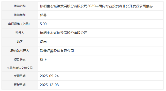 12月9日消息,据深交所披露,棕榈生态城镇发展股份有限公司2025年面向专业投资者非公开发行公司债券项目状态更新为“终止”,拟发行金额为5亿元,品种为私募,承销商/管理人为 联储证券 ,受理日期为2025年9月24日。