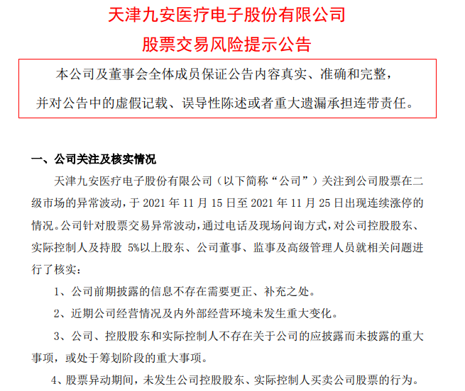 九安医疗11月25日晚间披露股票异动公告,公司子公司的新冠抗原家用自测OTC试剂盒在海外销售收入和疫情的发展密切相关,因疫情发展的不可预见性、疫苗接种计划的推进、产品应急使用授权(EUA)有效期,以及市场的发展和变化等多方面因素的影响,该产品获得美国应急使用授权(EUA)后,公司目前尚无法预测未来由该产品给公司营业收入和业绩带来的影响,请投资者注意投资风险。