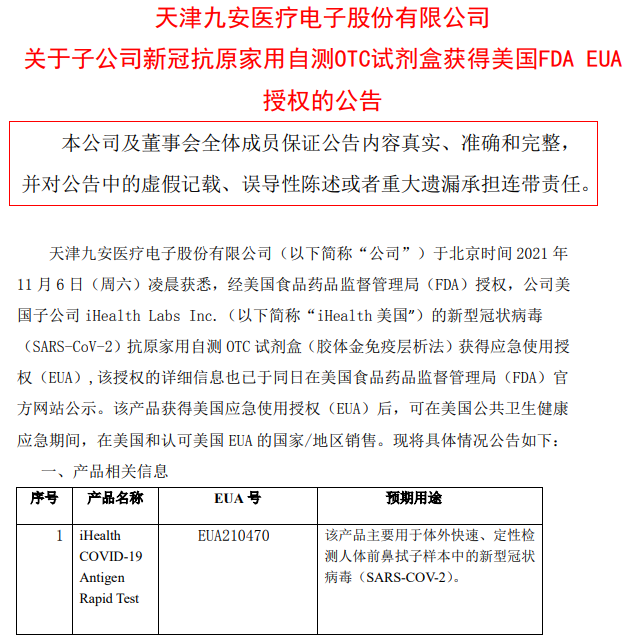 11月7日晚,九安医疗发布关于子公司新冠抗原家用自测OTC试剂盒获得美国FDA EUA授权的公告。该产品主要用于体外快速、定性检测人体前鼻拭子样本中的新型冠状病毒(SARS-COV-2)。