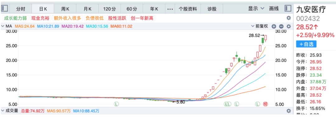 12月17日,九安医疗再度以涨停收盘,收报28.52元,总市值136.5亿元。