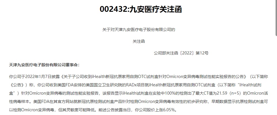 1月12日晚,深交所在对九安医疗发出的监管函中表示,希望九安医疗就几个事项作出说明,主要包括:样本CT值的含义;是否以部分样本阳性检出率来混淆全部样本阳性检出率误导投资者;实验结果是否可以代表总体情况等。