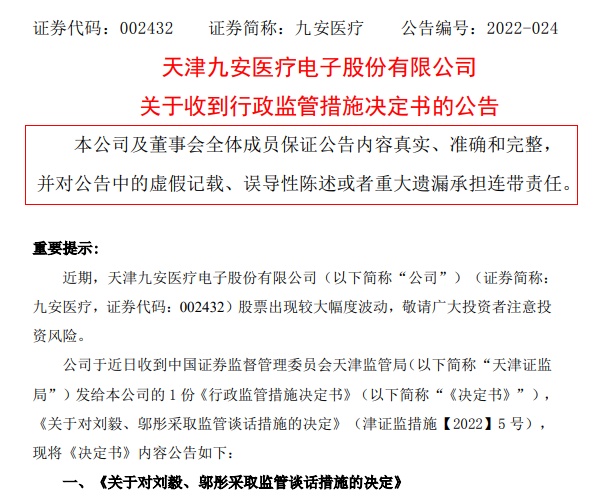 2月14日晚,九安医疗(002432.SZ)发布公告称,近日收到中国证券监督管理委员会天津监管局(以下简称“天津证监局”)发给九安医疗的《行政监管措施决定书》(以下简称《决定书》),决定对其公司董事长、总经理刘毅和董秘邬彤采取监管谈话措施。