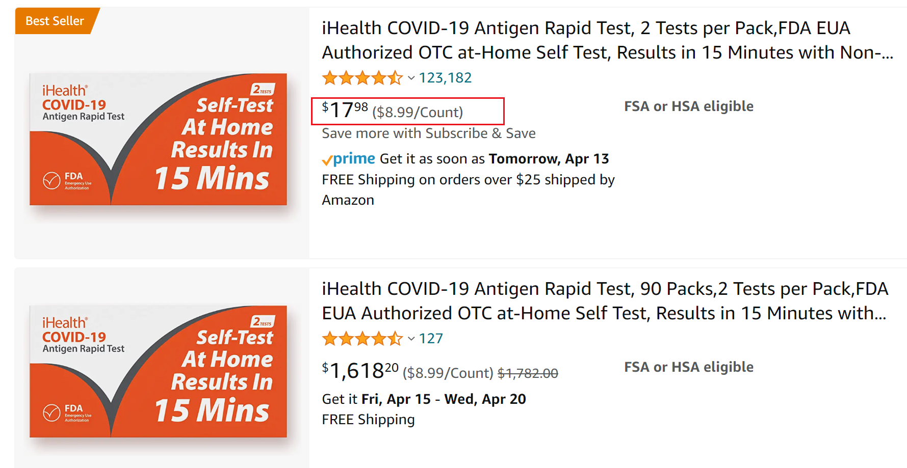 按照九安医疗1月公告与美国ACC的合同,约合为5.1美元/人份(32元人民币),批量采购的价格远超国内和欧洲的价格。零售市场,九安子公司iHealth的OTC家用抗原试剂盒在亚马逊的单价约合9美元/人份(57元人民币)。从九安的售价推测,利润率可达到80%-90%。