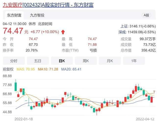 伴随着业绩增长的走势,上市11年以来长期股价雷打不动的九安医疗,在2021年开始被资本注意,仅2个月时间股价飙升11倍,2021年11月15日——2022年1月17日,股价涨幅累计1117.79%,到了4月11日,以每股67.7元的收盘价,助推市值来到324亿元。