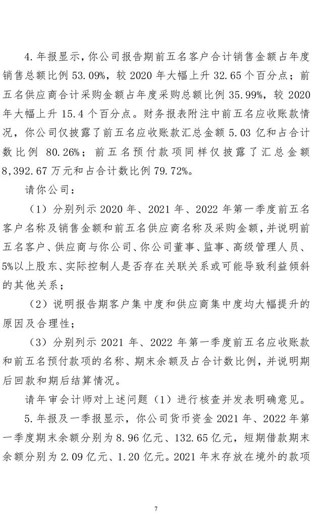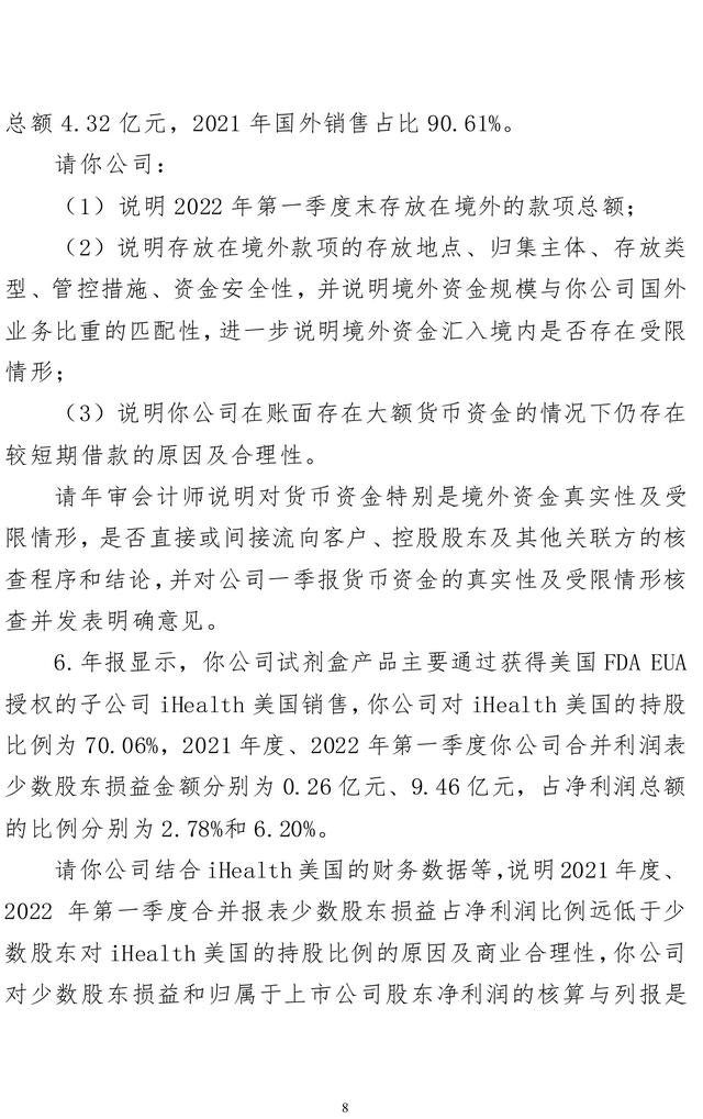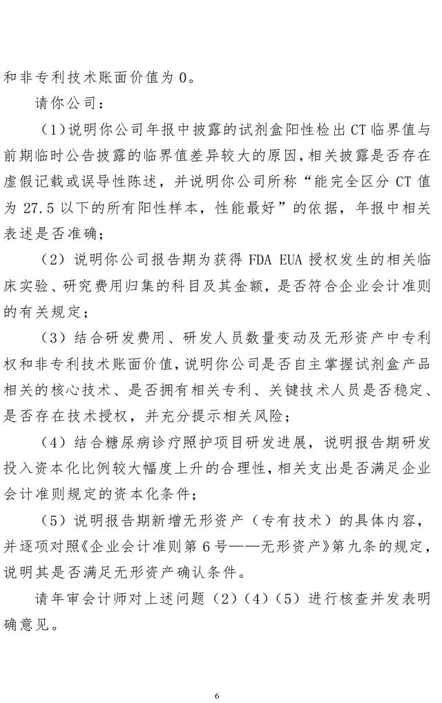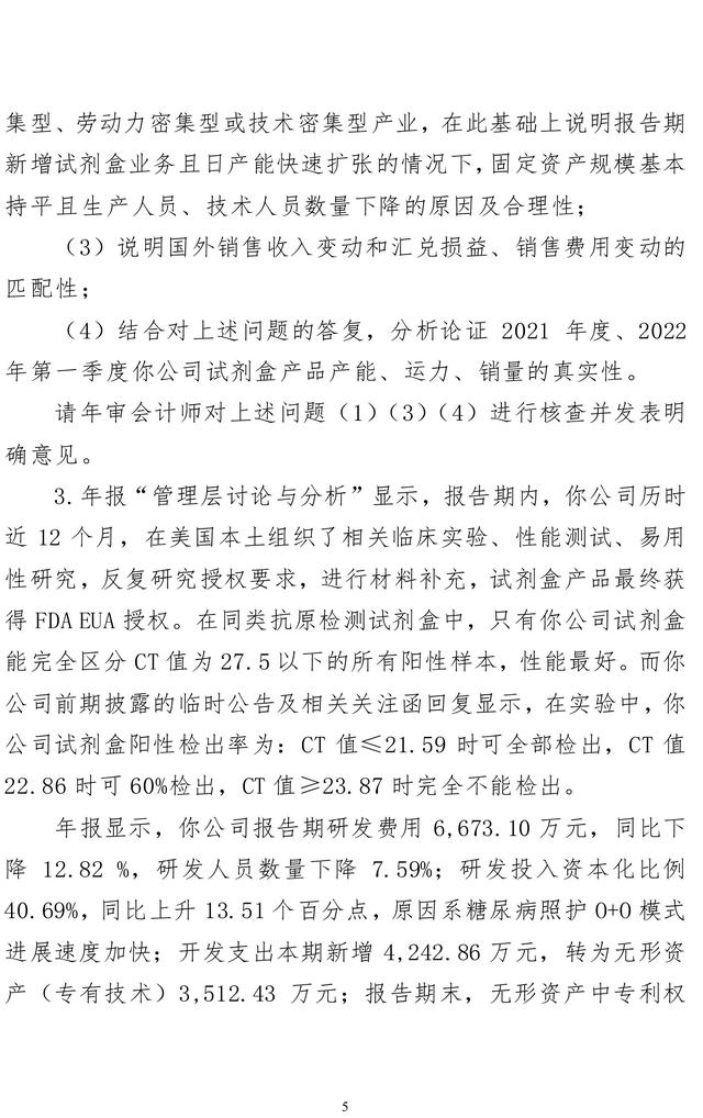 问询函涵盖了14个方面的35个问题,要求说明公司试剂盒产品业务模式与同行业公司是否存在显著差异;试剂盒产品毛利率水平较高的原因及商业合理性;2021年度、2022年第一季度公司营业成本变化与营收变动幅度存在重大差异的原因及合理性;公司试剂盒业务的盈利能力是否具有可持续性。