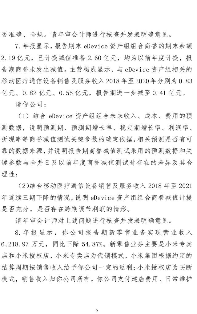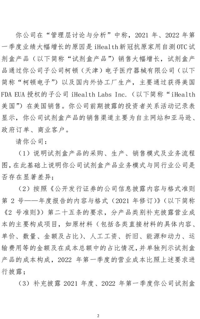 此外,问询函还要求九安医疗补充披露2021年度、2022年第一季度你公司通过自主网站和亚马逊、政府订单、商业客户销售试剂盒产品各自的收入占比和毛利率,并说明各销售渠道的收入确认政策、收入确认时点及其合规性。