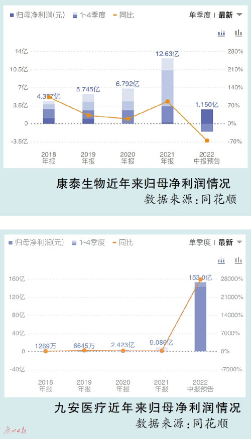 7月25日,康泰生物股价下跌,截至收盘,股价下跌4.92%,报收36.32元/股。记者关注到,股价下跌背后,康泰生物于7月24日发布的半年度业绩预告显示,上半年归属于上市公司股东的净利润1亿元至1.3亿元,较去年同期下降61.37%~70.29%。对于净利润大幅下滑的原因,康泰生物称,主要原因系新冠灭活疫苗相关资产计提减值及Ⅲ期临床支出费用化。记者关注到,今年上半年核酸检测与抗原检测公司的业绩分化明显,部分新冠检测相关企业出现了利润下滑。