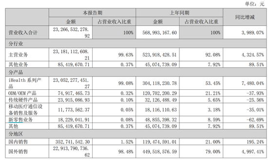 分产品来看,iHealth系列产品为九安医疗贡献了99.08%的营收,较去年同期增长7480.04%,ODM/OEM产品、传统硬件产品、移动医疗通信设备销售及服务、新零售业务等营收占比较去年同期均出现下跌。
