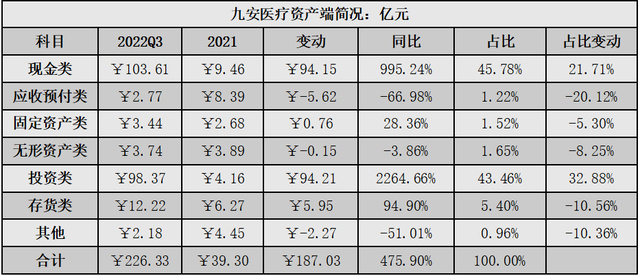 根据 2022 年 Q3 财报显示,公司总资产 226.33 亿元,相比年初大幅增加 187 亿元(+475.9%)。资产端增加主要受益于新冠抗原自测盒在美国销售带来大量的现金流入(2022Q1-Q3 经营净流入高达177亿元),管理层暂时将现金流用于理财,致现金资产和投资类资产合计占比近 90%。