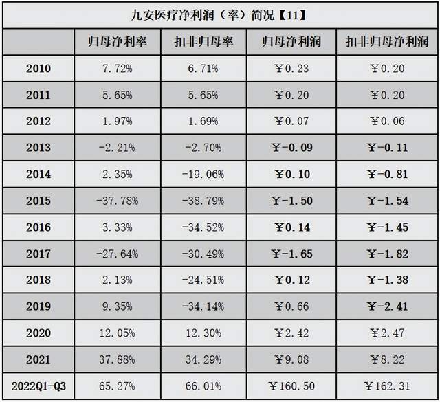 公司利用投资收益、商誉、减值等非经常性损益项目组合拳将净利润调节得没有连续两年亏损以避免带上 ST 的帽子(一年大亏一年小赚屡试不爽)--直观地看,在2010-2019年间,九安医疗累计收入45.23亿元,累计净利润为-1.72亿元,剔除非经常性项目后的扣非归母净利润则累计-9.06亿元。
