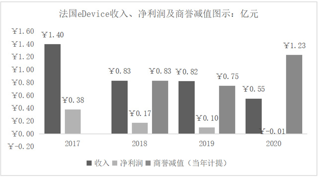 物联网消费电子领域主要由硬件设备和 APP 联网构成,公司与2016年出资6.98亿元收购法国eDevice(产生商誉4.89亿元),欲借助eDevice在数据处理和物联设备方便的经验达到协同,收购后公司业绩在2017年有所提振,随后eDevice收入持续和利润持续下滑。