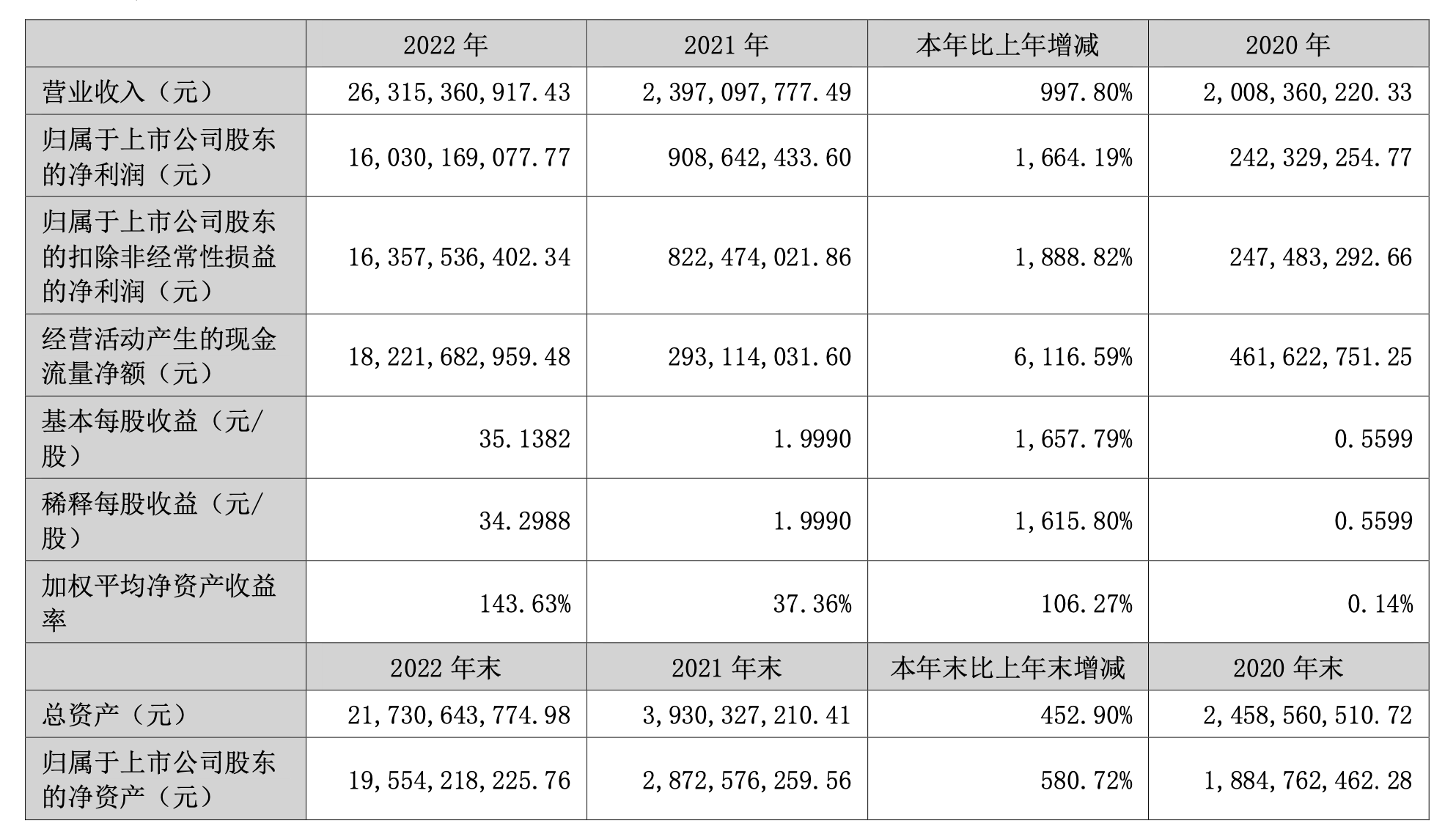 4月28日晚间,天津九安医疗电子股份有限公司(九安医疗,002432)发布2022年财报,期内实现营收263.15亿元,同比增997.8%;归属于上市公司股东的净利润160.3亿元,同比增1664.19%;归属于上市公司股东的扣除非经常性损益的净利润163.58亿元,同比增1888.82%。