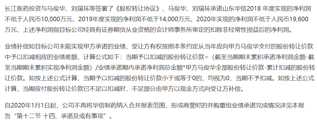 华信制药承诺,在2018年—2020年实现归母净利润不低于人民币1亿元、1.4亿元和1.96亿元。然而,华信制药仅2018年业绩达标,2019年亏损811.49万元,不仅未实现承诺利润,且拒绝配合长江健康的年度财务审计工作。