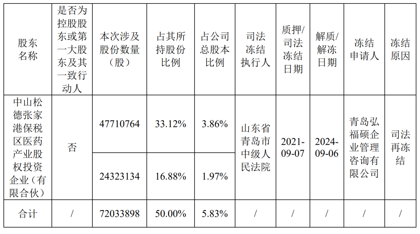 公告显示,长江健康收到持股5%以上股东中山松德张家港保税区医药产业股权投资企业(有限合伙)(以下简称“中山松德”)出具的《告知函》,获悉中山松德所持有的长江健康7203.39万股股份被司法冻结,占中山松德总股本比例为5.83%。