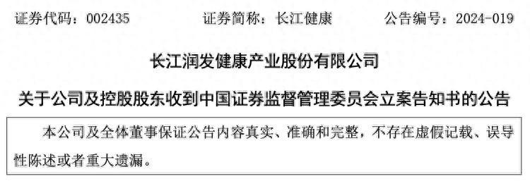 因涉嫌信披违规,长江健康(002435)及控股股东双双被证监会立案。