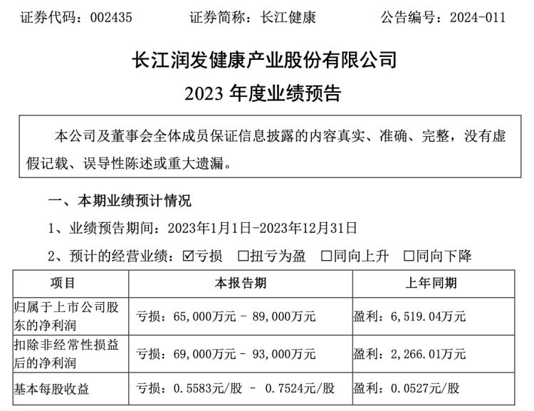 业绩方面,据长江健康1月31日披露的业绩预告,预计2023年归属于上市公司股东的净利润亏损6.5亿元~8.9亿元,同比由盈转亏。基本每股收益亏损0.5583元~0.7524元。上年同期基本每股收益盈利0.0527元。