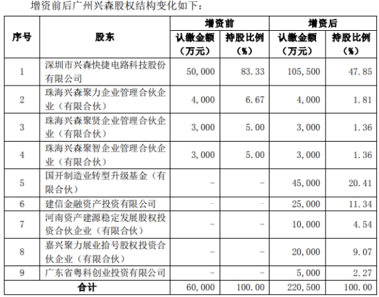 本次增资完成后,广州兴森注册资本由60,000万元增加至220,500万元,本次增资前,公司直接持有广州兴森83.33%股权,通过珠海兴森聚力企业管理合伙企业(有限合伙)(以下简称“珠海聚力”)、珠海兴森聚贤企业管理合伙企业(有限合伙)(以下简称“珠海聚贤”)、珠海兴森聚智企业管理合伙企业(有限合伙)(以下简称“珠海聚智”)合计间接持有广州兴森16.66%股权,广州兴森为公司控股子公司;本次增资后,公司直接持有广州兴森47.85%股权,通过珠海聚力、珠海聚贤、珠海聚智合计间接持有广州兴森4.53%股权,广州兴森仍为公司控股子公司。