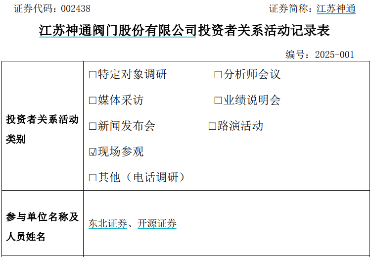 2月22日,上市公司江苏神通(002438.SZ)发布了《投资者关系活动记录表》,披露公司接待了东北证券、开源证券的现场参观及调研,公司副总裁章其强、证券事务代表:陈鸣迪出席,并接待投资机构代表提问。
