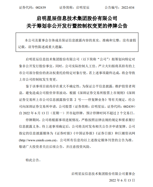 此外,公告称,鉴于该事项目前尚存在重大不确定性,为保证公平信息披露,维护投资者利益,避免造成公司股价异常波动,根据《深圳证券交易所股票上市规则》《深圳证券交易所上市公司信息披露指引第2号——停复牌业务》等有关规定,经公司向深圳证券交易所申请,公司股票自2022年6月13 日(星期一)开市起停牌,预计停牌时间不超过2个交易日。
