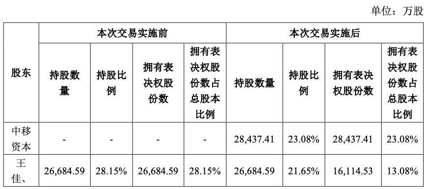上述事项实施完成后,王佳、严立夫妇合计持有上市公司共计 13.08%的表决权,上市公司实际控制人由王佳、严立夫妇变更为中国移动集团。