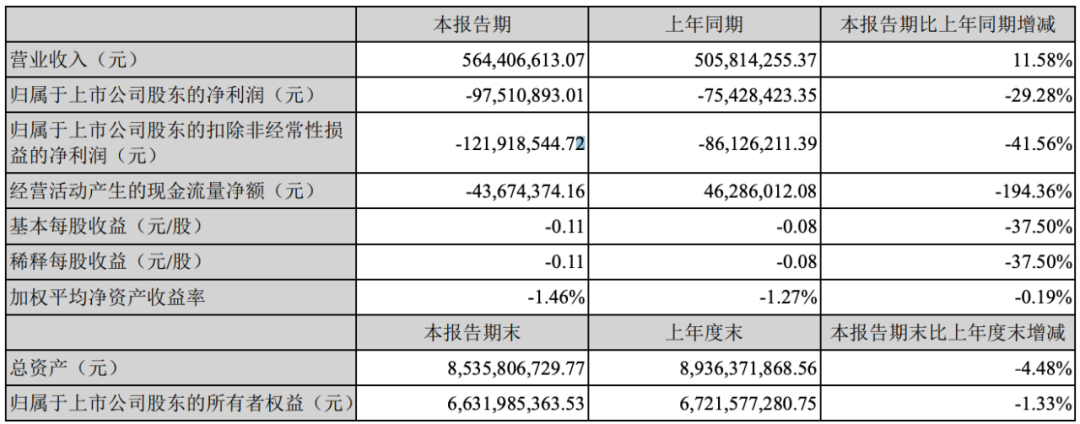 第一季度营收 5.64 亿,同比增长 11.58%;净利润-9751 万,亏损同比增加 29.28%。