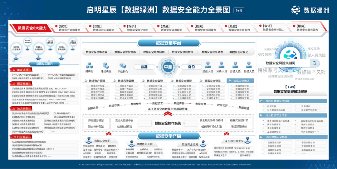 此外,在数据安全领域,启明星辰还推出面向数据的系统属性、业务属性、经济属性,全方位数据安全体系和能力战略构建--数据绿洲,至今已形成较完整的数据安全产品体系。数据绿洲融入了集团独特的场景化思维,以数据生命周期的保护为核心,围绕数据的收集、存储、使用、加工、传输、提供、公开等环节,构建赋能全场景的安全防护技术与能力体系,实现协同联动的纵深策略。