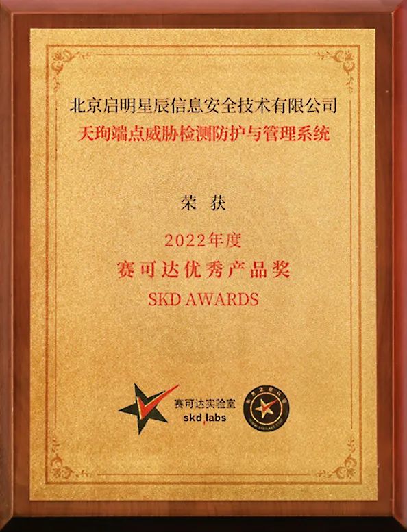 近日,2022年度赛可达优秀产品奖(SKD AWARDS)颁奖盛典在北京顺利举行。启明星辰天珣端点威胁检测防护与管理系统(以下简称“天珣EDR”)通过卓越的表现和出色的产品力,荣获2022年度赛可达优秀产品奖。