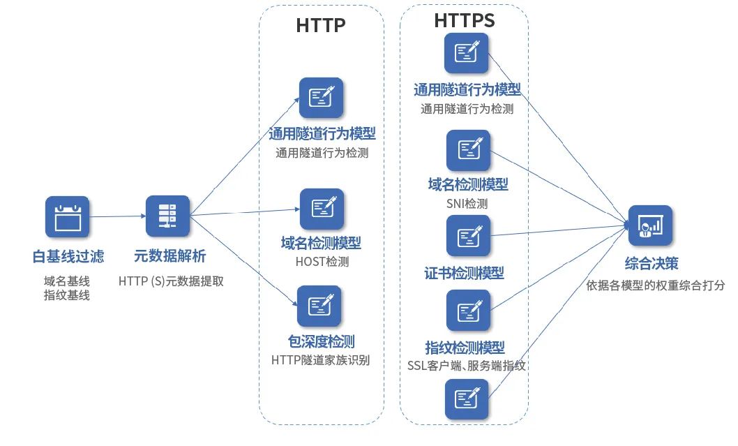 HTTPS隧道是HTTP隧道的加密升级版,可以利用TLS协议的特性更加充分地隐藏自己。由于HTTP(S)隧道的高度隐蔽性,单纯使用一种检测维度通常无法有效进行检测,需要采用多种检测手段进行综合决策。