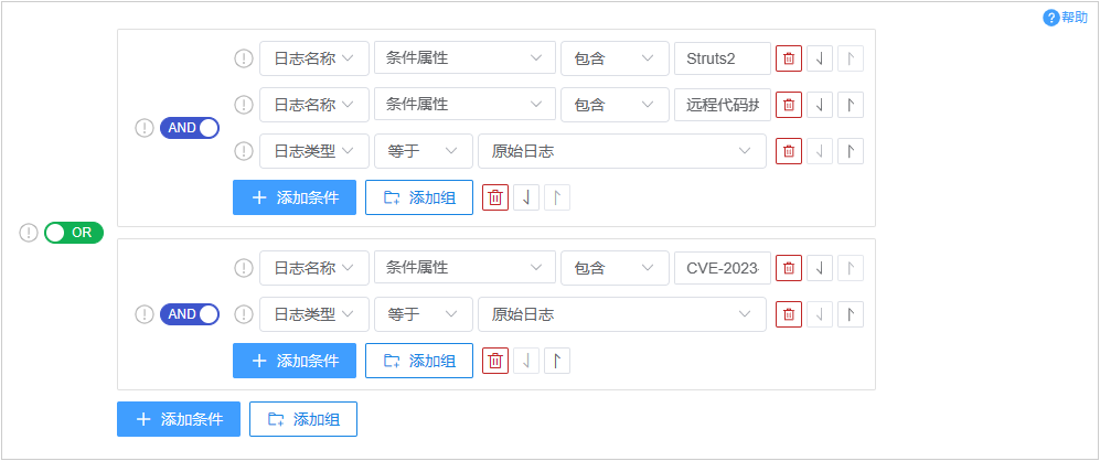 3)添加“L3_Apache_Struts2远程代码执行漏洞利用成功”,条件日志名称等于“L2_Apache_Struts2远程代码执行漏洞利用”,攻击结果等于“攻击成功”,目的地址引用资产漏洞或源地址匹配威胁情报,从而提升关联规则的置信度。