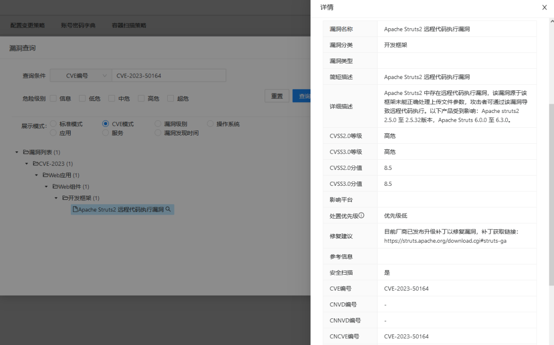 启明星辰资产与脆弱性管理平台实时采集并更新情报信息,对入库资产漏洞Apache Struts2中的远程代码执行漏洞(CVE-2023-50164)进行管理,如图所示: