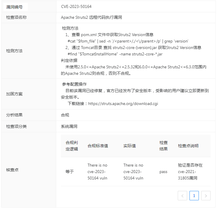 通过启明星辰天镜脆弱性扫描与管理系统-配置核查模块对该漏洞影响的Apache Struts2版本进行获取,使用智能化分析研判机制验证该漏洞是否存在,如果存在该漏洞建议更新到安全版本。如图所示: