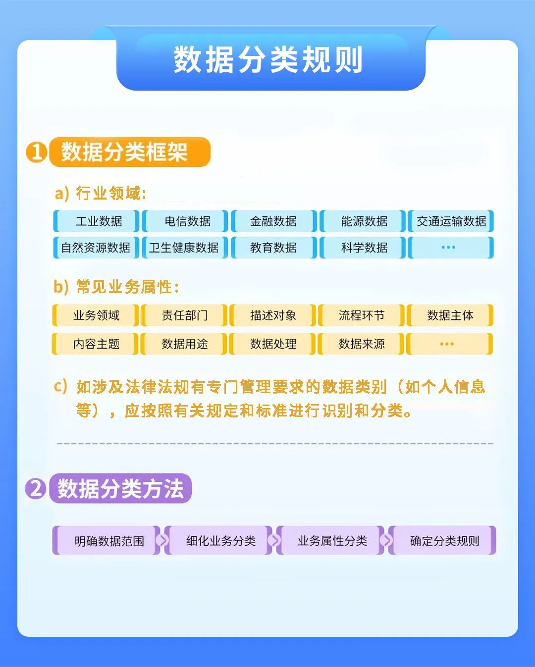 数据分类按照先行业领域分类、再业务属性分类的思路进行分类。例如,可以根据数据的来源、用途、处理方式等属性,将数据分为个人信息、商业秘密、国家秘密等不同类别。这样的分类有助于更好地理解数据的性质和价值,为制定针对性的安全管理措施提供依据。
