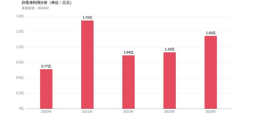 利润角度分析,2020年龙星科技实现归母净利润0.77亿元,2024年1.42亿元。利润水平在波动中呈现上升趋势。