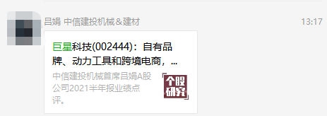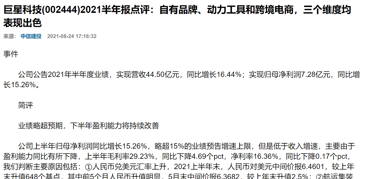 经记者查询,8月24日中信建投确有发布过一篇题为《自有品牌、动力工具和跨境电商,三个维度均表现出色》的巨星科技2021半年报点评报告。