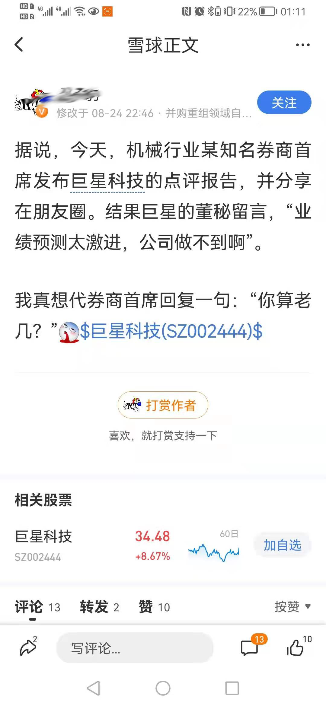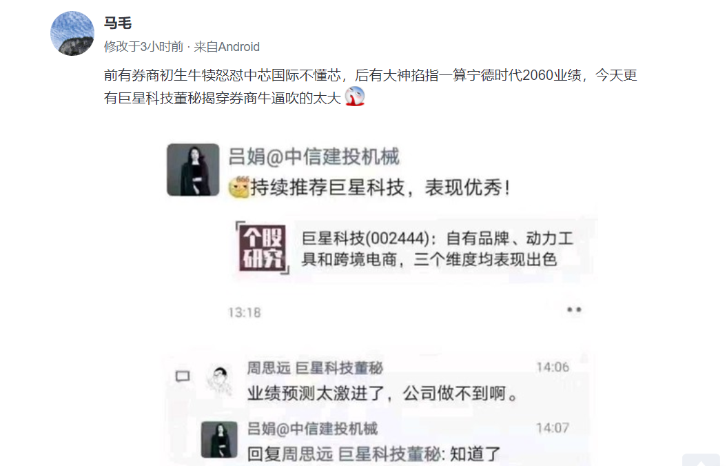 《每日经济新闻》记者注意到,8月24日晚间,有则消息在网络上得到较为广泛的传播——有中信建投分析师在朋友圈发布了一篇题为《自有品牌、动力工具和跨境电商,三个维度均表现出色》的巨星科技2021半年报点评微信推文,不过在这篇推文发布后不久因为其中的业绩预测显得有些脱离实际,遭到了巨星科技董秘的吐槽,“业绩预测太激进了,公司做不到啊”。
