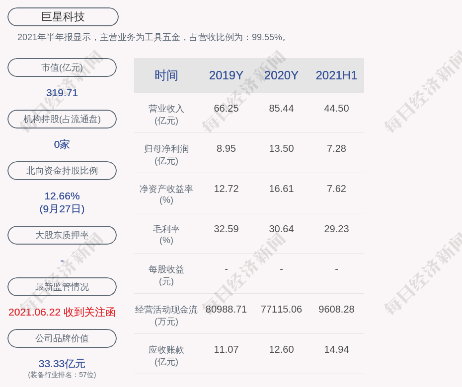 2021年半年报显示,巨星科技的主营业务为工具五金,占营收比例为:99.55%。