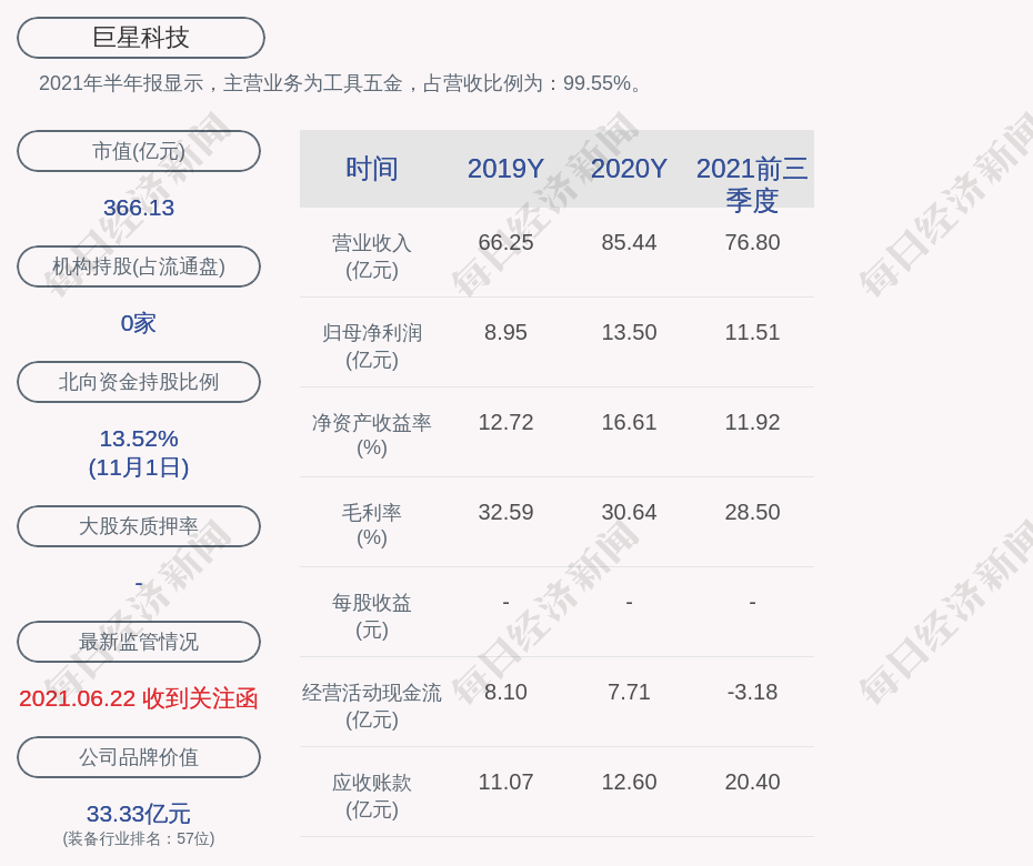 2021年半年报显示,巨星科技的主营业务为工具五金,占营收比例为:99.55%。