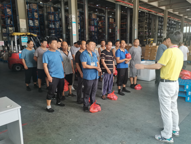 在海宁基地仓库,陈德远书记表示,露天装柜是夏天最恶劣的工作场景,公司不会忘记勤勤恳恳做贡献的同事,希望大家能够战高温、抢时间,努力保证货柜如期出运。