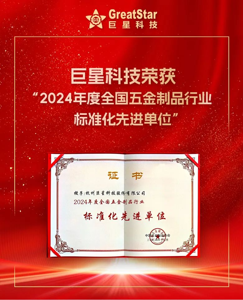 巨星科技荣获“2024年度全国五金制品行业标准化先进单位”