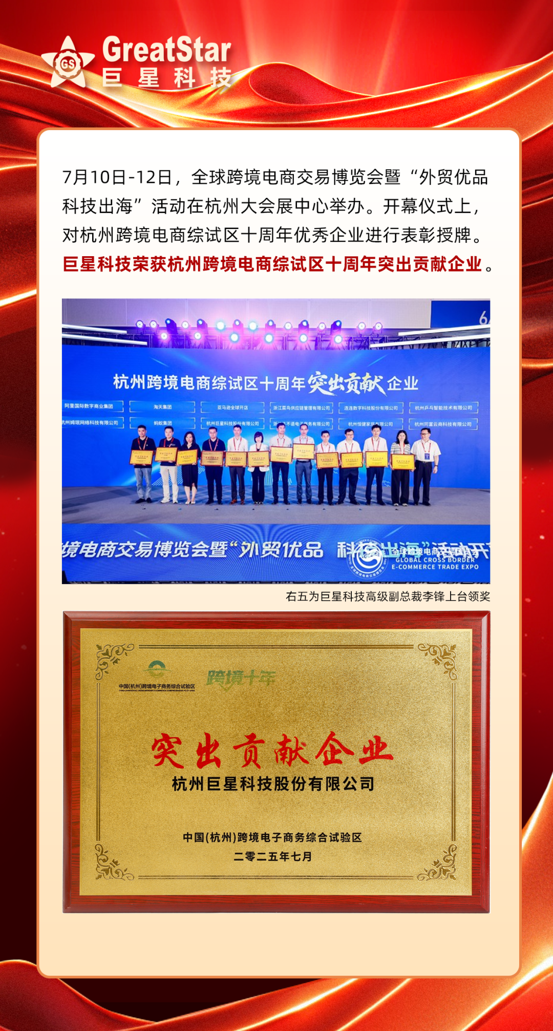 巨星科技荣获杭州跨境电商综试区十周年突出贡献企业
