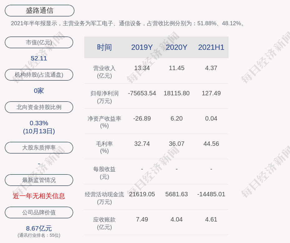 2021年半年报显示,盛路通信的主营业务为军工电子、通信设备,占营收比例分别为:51.88%、48.12%。